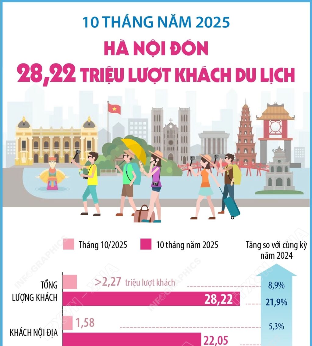 Tính chung 10 tháng năm 2025, Hà Nội đón 28,22 triệu lượt khách, tăng 21,9%. Trong đó, có 6,17 triệu lượt khách quốc tế, tăng 23,6%.
