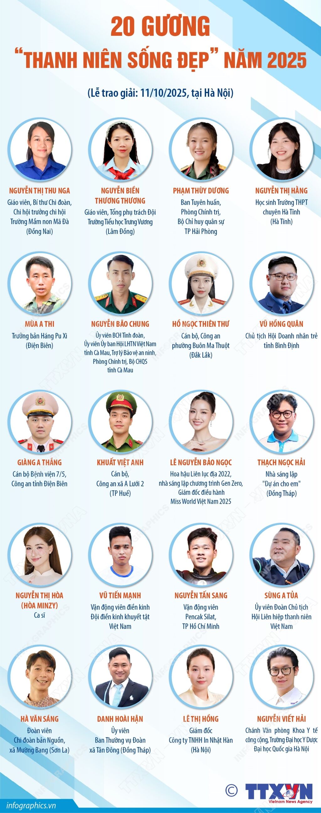 Tối 11/10/2025 tại Hà Nội, Trung ương Hội Liên hiệp Thanh niên Việt Nam phối hợp với Công ty TCP Việt Nam tổ chức Gala “Thanh niên sống đẹp” năm 2025, nhằm tôn vinh 20 gương mặt trẻ tiêu biểu có hành động đẹp, nghĩa cử nhân văn và đóng góp tích cực cho xã hội, lan tỏa tinh thần sống đẹp, sống có ích trong cộng đồng thanh niên Việt Nam.
