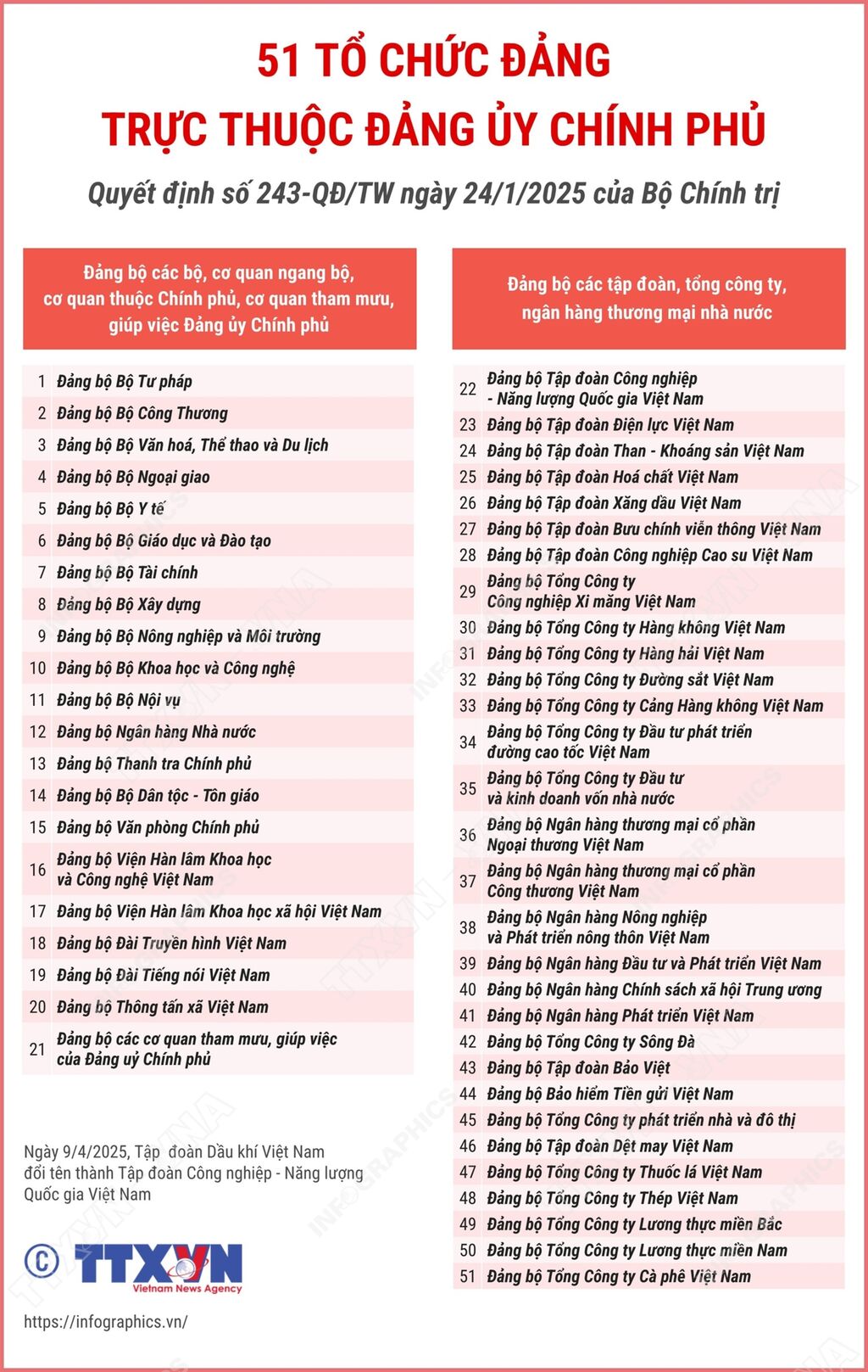 51 tổ chức đảng trực thuộc Đảng ủy Chính phủ gồm: Đảng bộ Bộ Tư pháp; Đảng bộ Bộ Công Thương; Đảng bộ Bộ Văn hoá, Thể thao và Du lịch; Đảng bộ Bộ Ngoại giao; Đảng bộ Bộ Y tế; Đảng bộ Bộ Giáo dục và Đào tạo; Đảng bộ Bộ Tài chính; Đảng bộ Bộ Xây dựng; Đảng bộ Bộ Nông nghiệp và Môi trường; Đảng bộ Bộ Khoa học và Công nghệ; Đảng bộ Bộ Nội vụ; Đảng bộ Ngân hàng Nhà nước; Đảng bộ Thanh tra Chính phủ; Đảng bộ Bộ Dân tộc - Tôn giáo; Đảng bộ Văn phòng Chính phủ; Đảng bộ Viện Hàn lâm Khoa học và Công nghệ Việt Nam; Đảng bộ Viện Hàn lâm Khoa học xã hội Việt Nam; Đảng bộ Đài Truyền hình Việt Nam; Đảng bộ Đài Tiếng nói Việt Nam; Đảng bộ Thông Tấn xã Việt Nam; Đảng bộ các cơ quan tham mưu, giúp việc của Đảng uỷ Chính phủ; Đảng bộ Tập đoàn Công nghiệp - Năng lượng Quốc gia Việt Nam; Đảng bộ Tập đoàn Điện lực Việt Nam; Đảng bộ Tập đoàn Than - Khoáng sản Việt Nam; Đảng bộ Tập đoàn Hoá chất Việt Nam; Đảng bộ Tập đoàn Xăng dầu Việt Nam; Đảng bộ Tập đoàn Bưu chính viễn thông Việt Nam; Đảng bộ Tập đoàn Công nghiệp Cao su Việt Nam; Đảng bộ Tổng Công ty Công nghiệp Xi măng Việt Nam; Đảng bộ Tổng Công ty Hàng không Việt Nam; Đảng bộ Tổng Công ty Hàng hải Việt Nam; Đảng bộ Tổng Công ty Đường sắt Việt Nam; Đảng bộ Tổng Công ty Cảng Hàng không Việt Nam; Đảng bộ Tổng Công ty Đầu tư phát triển đường cao tốc Việt Nam; Đảng bộ Tổng Công ty Đầu tư và kinh doanh vốn nhà nước; Đảng bộ Ngân hàng thương mại cổ phần Ngoại thương Việt Nam; Đảng bộ Ngân hàng thương mại cổ phần Công thương Việt Nam; Đảng bộ Ngân hàng Nông nghiệp và Phát triển nông thôn Việt Nam; Đảng bộ Ngân hàng Đầu tư và Phát triển Việt Nam; Đảng bộ Ngân hàng Chính sách xã hội Trung ương; Đảng bộ Ngân hàng Phát triển Việt Nam; Đảng bộ Tổng Công ty Sông Đà; Đảng bộ Tập đoàn Bảo Việt; Đảng bộ Bảo hiểm Tiền gửi Việt Nam; Đảng bộ Tổng Công ty phát triển nhà và đô thị; Đảng bộ Tập đoàn Dệt may Việt Nam; Đảng bộ Tổng Công ty Thuốc lá Việt Nam; Đảng bộ Tổng Công ty Thép Việt Nam; Đảng bộ Tổng Công ty Lương thực miền Bắc; Đảng bộ Tổng Công ty Lương thực miền Nam; Đảng bộ Tổng Công ty Cà phê Việt Nam./.