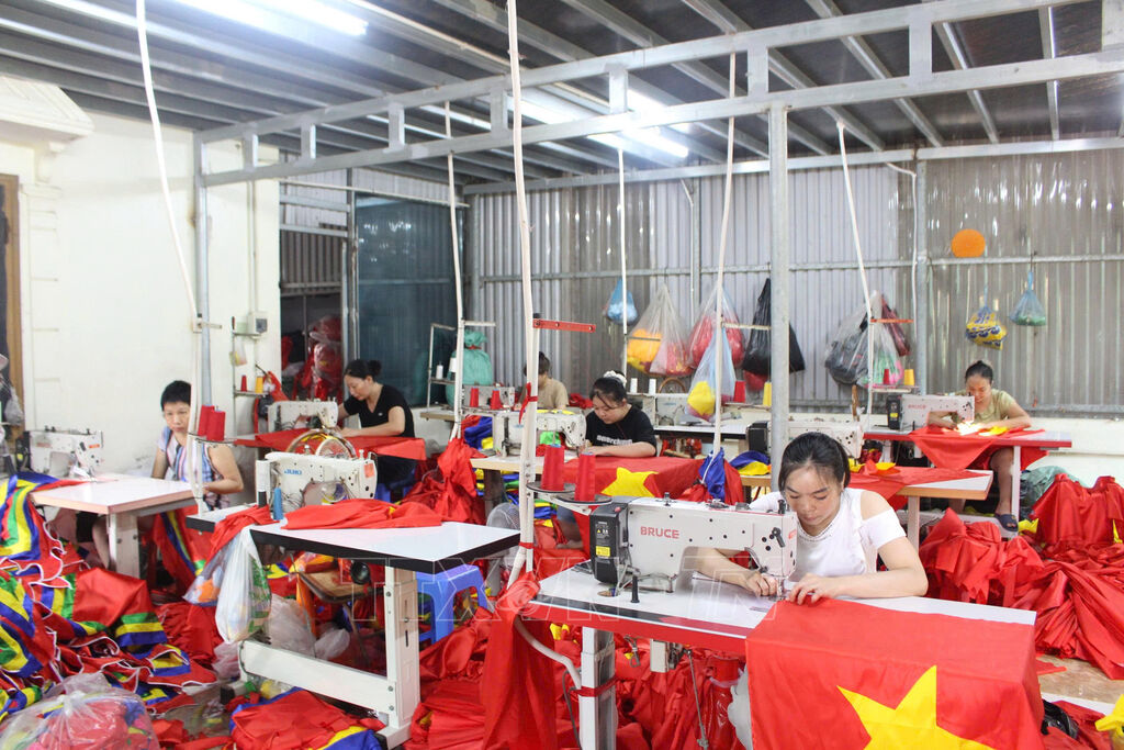 Tại xưởng may cờ Trung Anh (thôn Giáp Long, xã Chương Dương), anh Nguyễn Văn Trung (chủ cơ sở) đang tất bật với số liệu, sổ sách. Thời điểm này, cả gia đình anh đều sắp xếp công việc để tập trung hoàn thiện các đơn hàng lớn. Ngoài thợ may, thợ cắt chính, xưởng của anh phải thuê thêm một số lao động thời vụ để kịp tiến độ giao hàng.