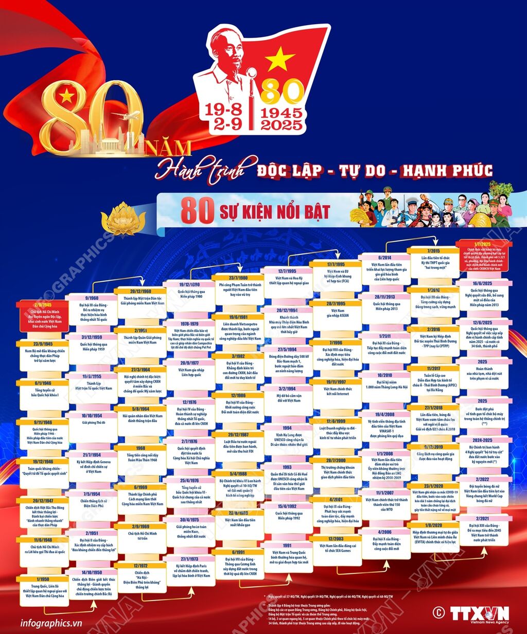 Cách mạng Tháng Tám và Quốc khánh 2/9 đã mở ra kỷ nguyên độc lập, tự do cho dân tộc Việt Nam, đưa nhân dân ta từ thân phận nô lệ trở thành người làm chủ đất nước, làm chủ vận mệnh của mình. 80 năm qua, dưới sự lãnh đạo của Đảng, dân tộc ta đã kiên cường đấu tranh, giành những thắng lợi vĩ đại, viết tiếp những trang sử hào hùng, xây dựng một Việt Nam hùng cường, thịnh vượng, hạnh phúc. Cùng nhìn lại 80 năm Hành trình Độc lập - Tự do - Hạnh phúc ấy qua 80 sự kiện nổi bật.