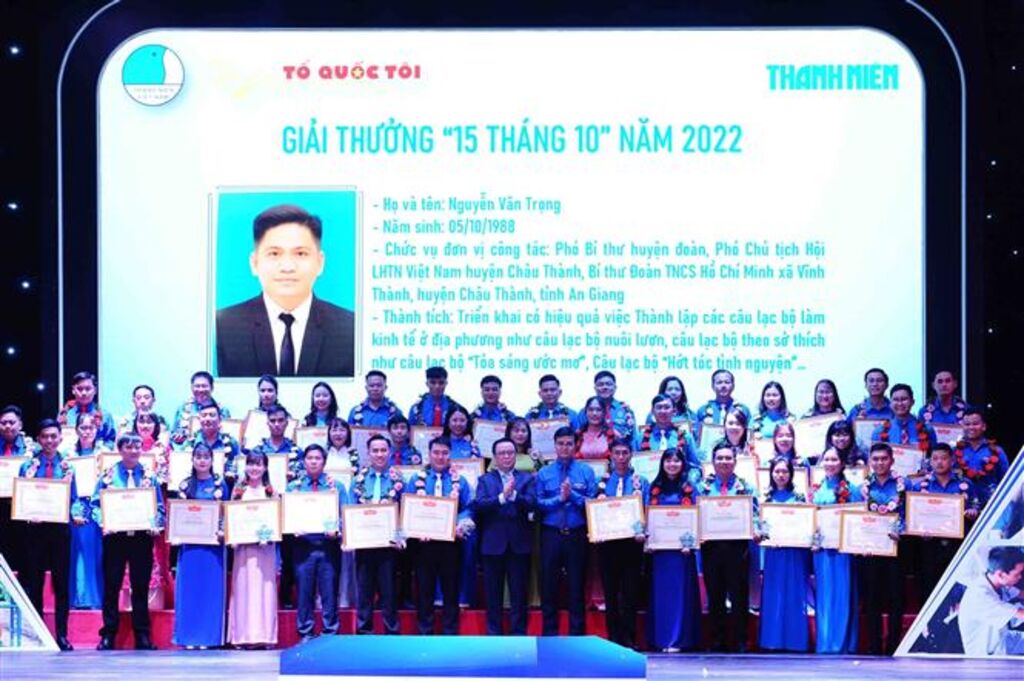 Bí thư thứ nhất Trung ương Đoàn Bùi Quang Huy trao Giải thưởng “15 Tháng 10” năm 2022 cho các cá nhân có thành tích xuất sắc, tiêu biểu trong công tác Hội và phong trào thanh niên. (Ảnh: Minh Đức/TTXVN)