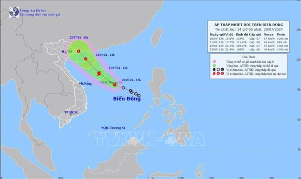 Hồi 13 giờ ngày 20/7, vị trí tâm áp thấp nhiệt đới ở vào khoảng 15,8 độ Vĩ Bắc; 114 độ Kinh Đông, cách Hoàng Sa khoảng 250km về phía Đông Đông Nam. Sức gió mạnh nhất vùng gần tâm áp thấp nhiệt đới mạnh cấp 7 (50-61km/h), giật cấp 9; di chuyển theo hướng Tây Tây Bắc với tốc độ 10-15km/h.