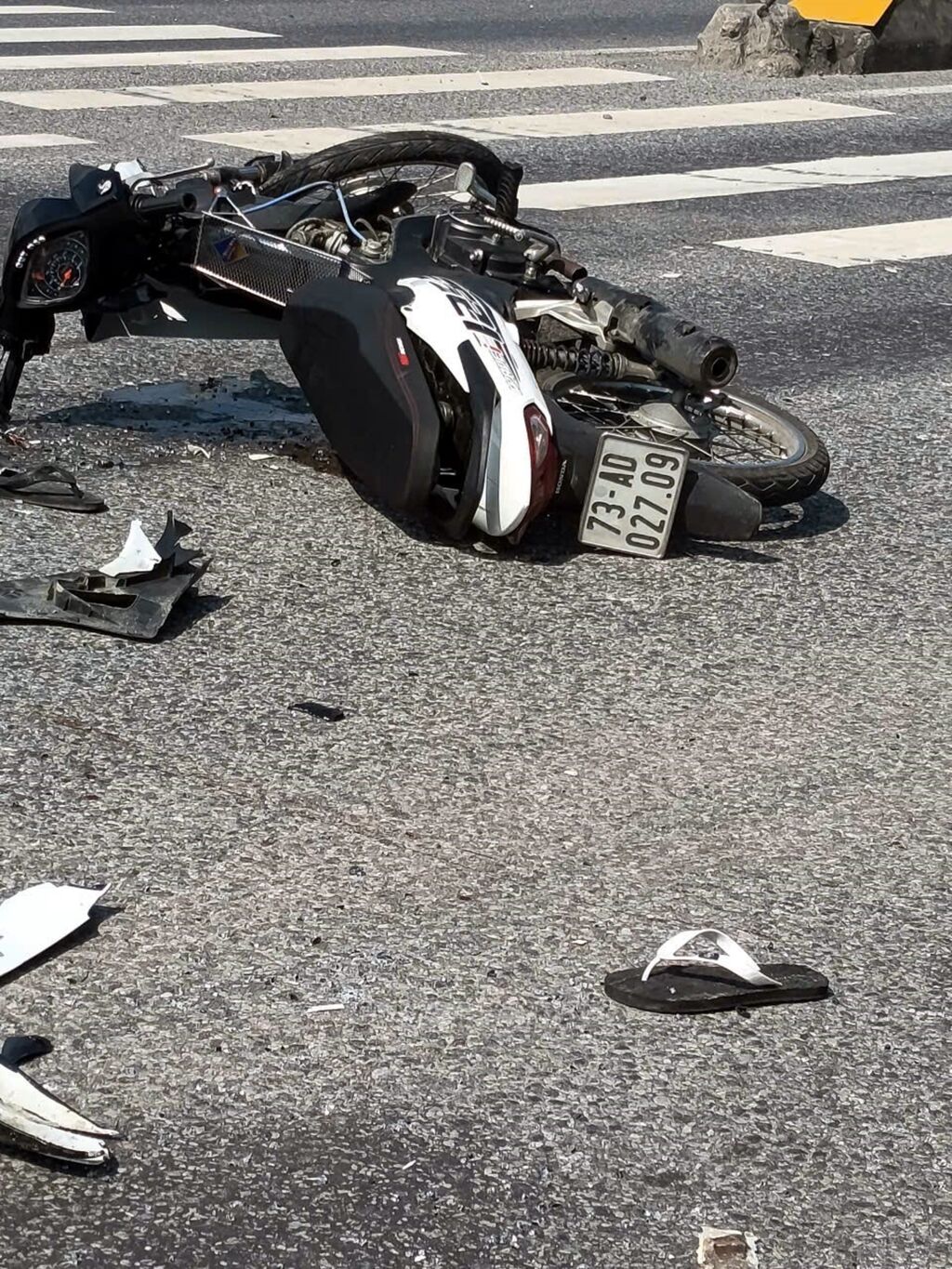 Xe máy chở 3 người bị hư hỏng nặng sau vụ tai nạn.