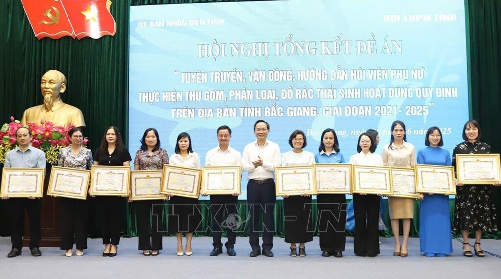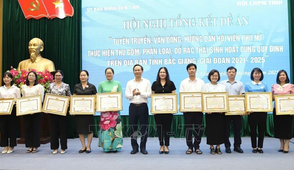 Ngày 6/6 tại thành phố Bắc Giang, Ủy ban nhân dân tỉnh Bắc Giang và Hội Liên hiệp Phụ nữ tỉnh tổ chức tổng kết Đề án Tuyên truyền, vận động, hướng dẫn hội viên phụ nữ thực hiện thu gom, phân loại, đổ rác thải sinh hoạt đúng quy định trên địa bàn, giai đoạn 2021 - 2025.