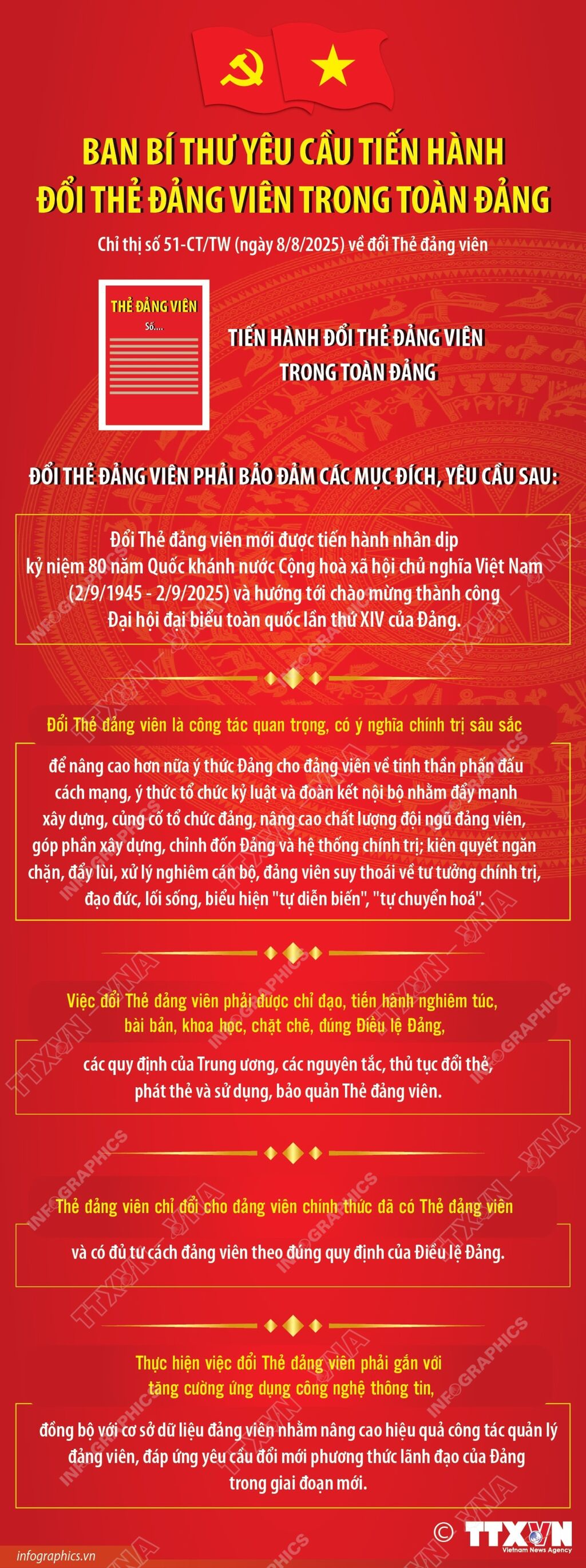 Chỉ thị số 51-CT/TW nêu rõ: Đổi Thẻ đảng viên mới được tiến hành nhân dịp kỷ niệm 80 năm Quốc khánh nước Cộng hoà xã hội chủ nghĩa Việt Nam (2/9/1945 - 2/9/2025) và hướng tới chào mừng thành công Đại hội đại biểu toàn quốc lần thứ XIV của Đảng./.