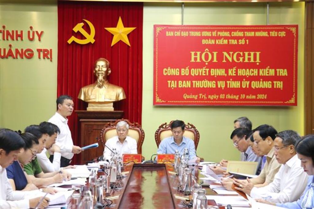 Tại buổi kiểm tra, đại diện Đoàn kiểm tra đã công bố Kế hoạch kiểm tra số 44-KH/BCĐTW, ngày 25/8/2024 về kiểm tra việc lãnh đạo, chỉ đạo, tổ chức thực hiện cơ chế phối hợp, phát hiện, xử lý tham nhũng, tiêu cực qua hoạt động kiểm tra, thanh tra, điều tra, truy tố, xét xử, thi hành án; Quyết định kế hoạch kiểm tra số 45-QĐ/BCĐTW, ngày 28/5/2024. Theo đó, mốc thời gian kiểm tra tại Quảng Trị từ năm 2021-2024, Đoàn chia làm 2 tổ để tiến hành kiểm tra. Đây là hoạt động kiểm tra thường xuyên của Ban Chỉ đạo Trung ương.