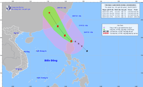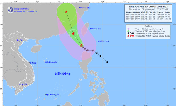 TTXVN - Theo Trung tâm Dự báo khí tượng thủy văn Quốc gia, hồi 16 giờ ngày 27/7, vị trí tâm bão số 2 ở vào khoảng 21,3 độ Vĩ Bắc, 119,2 độ Kinh Đông, cách Phúc Kiến (Trung Quốc) khoảng 350km về phía Nam Đông Nam. Sức gió mạnh nhất vùng gần tâm bão mạnh cấp 13-14 (134-166km/giờ), giật cấp 16.