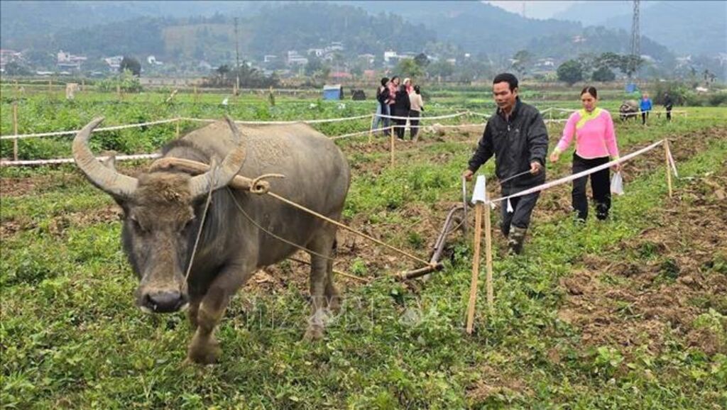 Theo sau luống cày, các phụ nữ Giáy duyên dáng trong trang phục truyền thống của dân tộc vung tay gieo hạt giống đầu Xuân, ước mong mùa màng bội thu, đời sống vật chất và tinh thần ngày càng được nâng cao, phát triển.