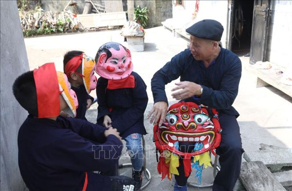 Truyền dạy trực tiếp cho lớp măng non của đội múa sư tử thôn Cốc Lào, xã Hội Hoan để di sản luôn được bảo tồn và phát huy. (Ảnh: Anh Tuấn/TTXVN)
