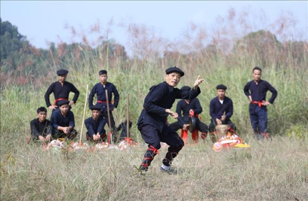 Trong múa sư tử thôn Cốc Lào, xã Hội Hoan không thể thiếu phần biểu diễn động tác võ thuật như các bài quyền, kiếm, binh khí thể hiện sức mạnh, sự dẻo dai của con người để bảo vệ dân làng trước mọi hiểm nguy. (Ảnh: Anh Tuấn/TTXVN)