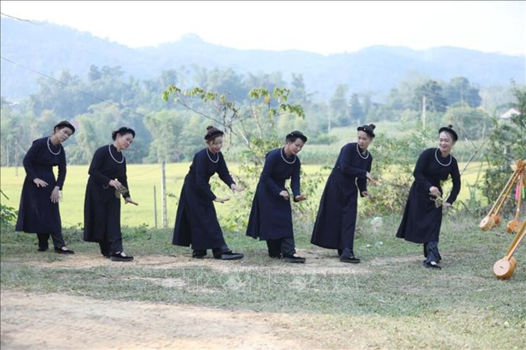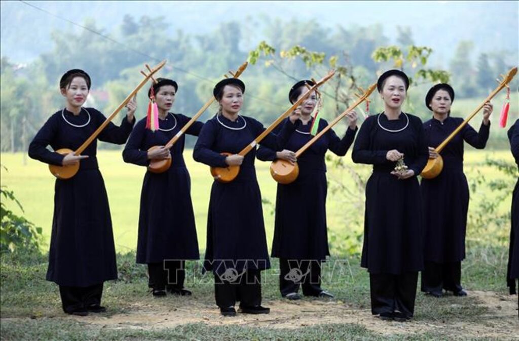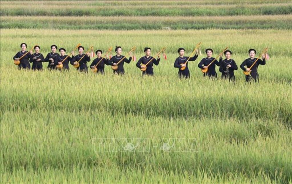 Câu lạc bộ đàn tính hát Then Hương Hồi, xã Hội Hoan biểu diễn tiết mục “Hội Hoan đón bạn”, “Đường về bản em”. (Ảnh: Anh Tuấn/TTXVN)