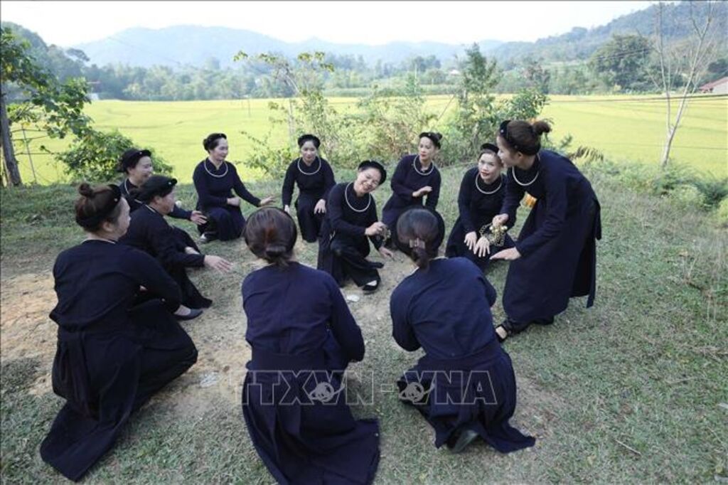 Thế hệ trước của câu lạc bộ đàn tính hát Then Hương Hồi, xã Hội Hoan truyền dạy cho thế hệ sau điệu “Múa trầu”. (Ảnh: Anh Tuấn/TTXVN)