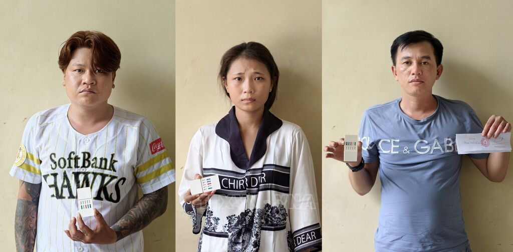 Trong khi đó, tại phòng trên lầu ba, lực lượng công an phát hiện thêm 3 đối tượng (2 nam, 1 nữ) cùng tang vật là một bộ dụng cụ sử dụng ma túy đá đã bị đập vỡ và 3 gói chứa tinh thể màu trắng mà các đối tượng khai là ma túy đá.