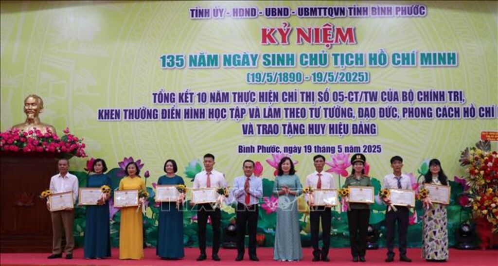 Dịp này, Tỉnh ủy Bình Phước trao Huy hiệu 30 đến 70 năm tuổi Đảng cho 308 đảng viên; UBND tỉnh Bình Phước tặng Bằng khen cho 14 tập thể và 19 cá nhân có thành tích xuất sắc trong học tập và làm theo tư tưởng, đạo đức, phong cách Hồ Chí Minh giai đoạn 2016 - 2025. Tỉnh ủy Bình Phước trao 3 giải A, 7 giải B, 10 giải C và 16 giải Khuyến khích cho các tác giả, nhóm tác giả đoạt Giải thưởng sáng tác, quảng bá tác phẩm văn học, nghệ thuật, báo chí về chủ đề “Học tập và làm theo tư tưởng, đạo đức, phong cách Hồ Chí Minh” giai đoạn 2 (2023 – 2025)./.