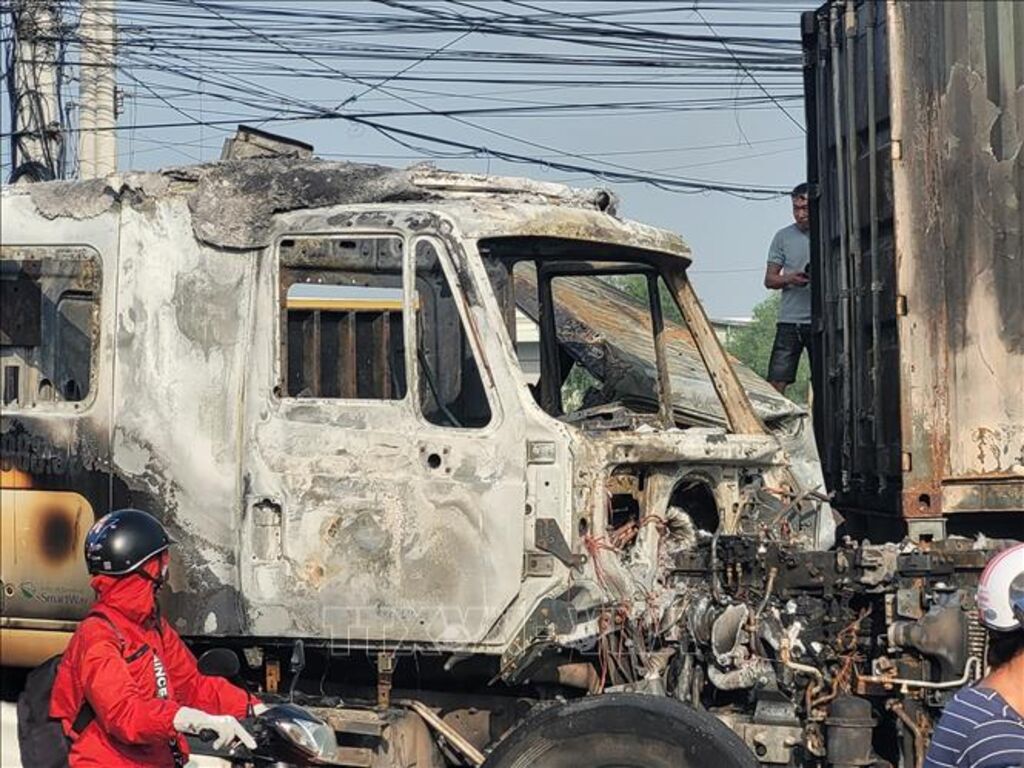 TTXVN - Rạng sáng 10/7, trên địa bàn thành phố Dĩ An, tỉnh Bình Dương xảy ra vụ tai nạn giao thông, hai xe đầu kéo container va chạm rồi dính vào nhau, dẫn đến bốc cháy dữ dội. Lực lượng chức năng địa phương rất vất vả mới dập tắt được đám cháy. Vụ tai nạn khiến cửa ngõ vào thành phố Dĩ An ùn tắc.