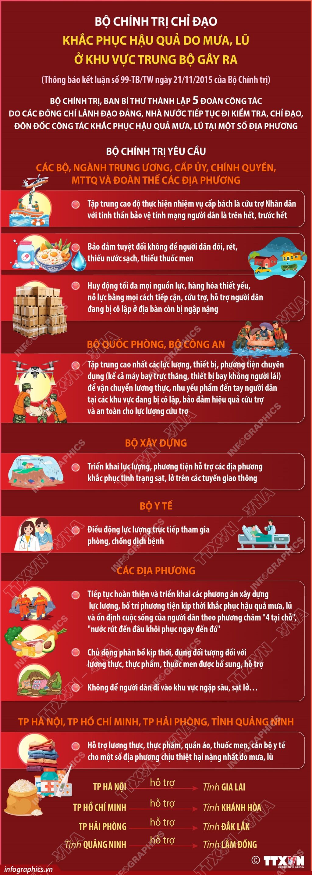 Ngày 21/11/2025, Ủy viên Bộ Chính trị, Thường trực Ban Bí thư Trần Cẩm Tú ký Thông báo Kết luận của Bộ Chính trị về khắc phục hậu quả do mưa, lũ ở khu vực Trung Bộ gây ra (Thông báo số 99-TB/TW). Để kịp thời khắc phục hậu quả mưa, lũ, Bộ Chính trị yêu cầu: Tập trung cao độ thực hiện nhiệm vụ cấp bách là cứu trợ Nhân dân với tinh thần bảo vệ tính mạng người dân là trên hết, trước hết; bảo đảm tuyệt đối không để người dân đói, rét, thiếu nước sạch, thiếu thuốc men; huy động tối đa mọi nguồn lực, hàng hoá thiết yếu, nỗ lực bằng mọi cách tiếp cận, cứu trợ, hỗ trợ người dân đang bị cô lập ở địa bàn còn bị ngập nặng. Bộ Chính trị, Ban Bí thư thành lập 5 đoàn công tác do các đồng chí lãnh đạo Đảng, Nhà nước tiếp tục đi kiểm tra, chỉ đạo, đôn đốc công tác khắc phục hậu quả mưa, lũ tại một số địa phương.