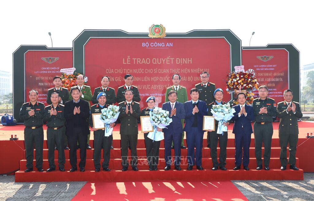 Tại buổi lễ, thừa ủy quyền của Chủ tịch nước, Bộ Công an đã tổ chức Lễ trao Quyết định của Chủ tịch nước về việc cử sĩ quan đi thực hiện nhiệm vụ gìn giữ hòa bình Liên hợp quốc tại Phái bộ UNISFA, khu vực Abyei gồm: Thiếu tá Nguyễn Phi Hùng, Đại úy Nguyễn Thị Hồng Vân và Đại úy Nguyễn Hùng Sơn./.