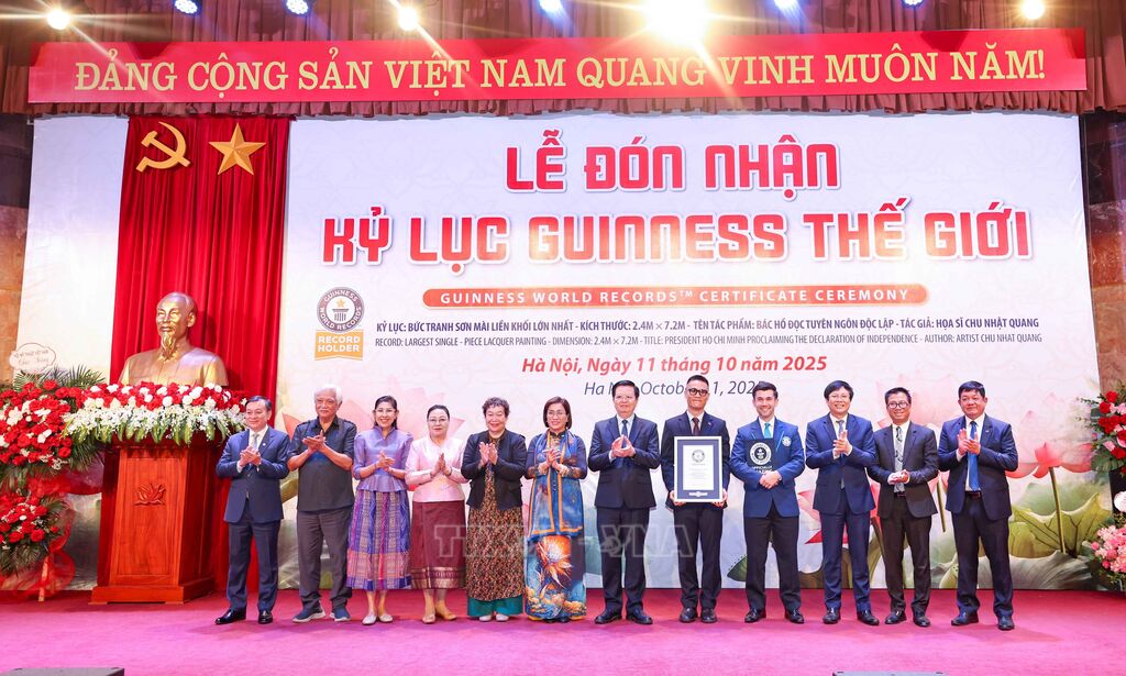 Tại buổi lễ, Phó Chủ tịch thường trực Hội Mỹ thuật Việt Nam Mai Thị Ngọc Oanh chia sẻ, bức tranh “Bác Hồ đọc Tuyên ngôn Độc lập” được Tổ chức Kỷ lục Guinness Thế giới chính thức công nhận là bức tranh sơn mài không ghép lớn nhất thế giới là sự kiện đặc biệt và đầy tự hào. Bởi đây là lần đầu tiên một tác phẩm sơn mài Việt Nam được công nhận tại Kỷ lục Guinness Thế giới, cũng là lần đầu tiên Kỷ lục Guinness Thế giới xác lập một kỷ lục về tranh sơn mài. Đó không chỉ là vinh dự của riêng tác giả, Hội Mỹ thuật Việt Nam, mà còn là niềm tự hào của cả dân tộc.