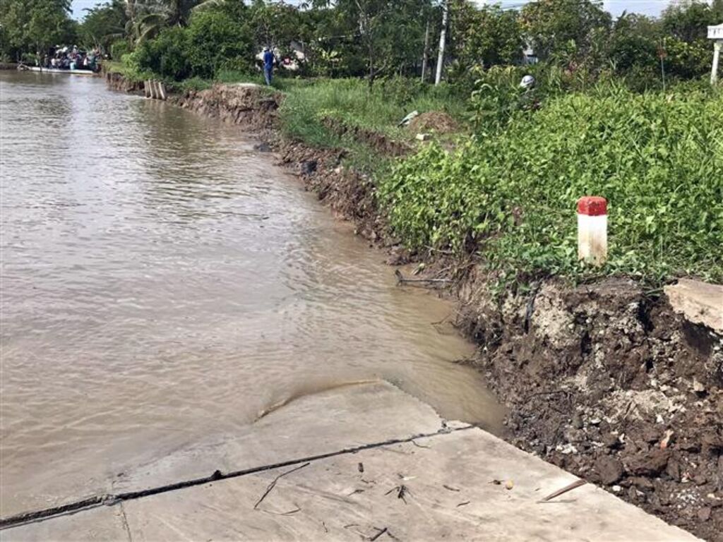(TTXVN) - Trước đó, khoảng 3 giờ cùng ngày, tại ấp Thuận Thành, xã Tân Tiến (cách UBND xã Tân Tiến về hướng xã Nguyễn Huân khoảng 1,5km - khu vực ngã ba Cây Tàng), vụ sạt lở đã xảy ra với chiều dài khoảng 110m, khiến đoạn đường ô tô về trung tâm xã Nguyễn Huân bị sạt lở hoàn toàn xuống sông, các phương tiện giao thông thể lưu thông.