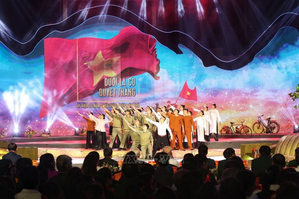 TTXVN - Kỷ niệm 70 năm Chiến thắng Điện Biên Phủ (7/5/1954-7/5/2024), Cầu truyền hình "Dưới lá cờ quyết thắng" do Đài Truyền hình Việt Nam thực hiện đã diễn ra tối 5/5 tại 5 điểm cầu: Khu vực Sân hành lễ, Tượng đài Chiến thắng Điện Biên Phủ tại đồi D1 (Điện Biên); Quảng trường Ba Đình (Hà Nội); Quảng trường Lam Sơn (Thanh Hóa); Nhà rông Kon Klor (Kon Tum), Khu di tích Cột cờ Thủ Ngữ (Thành phố Hồ Chí Minh).