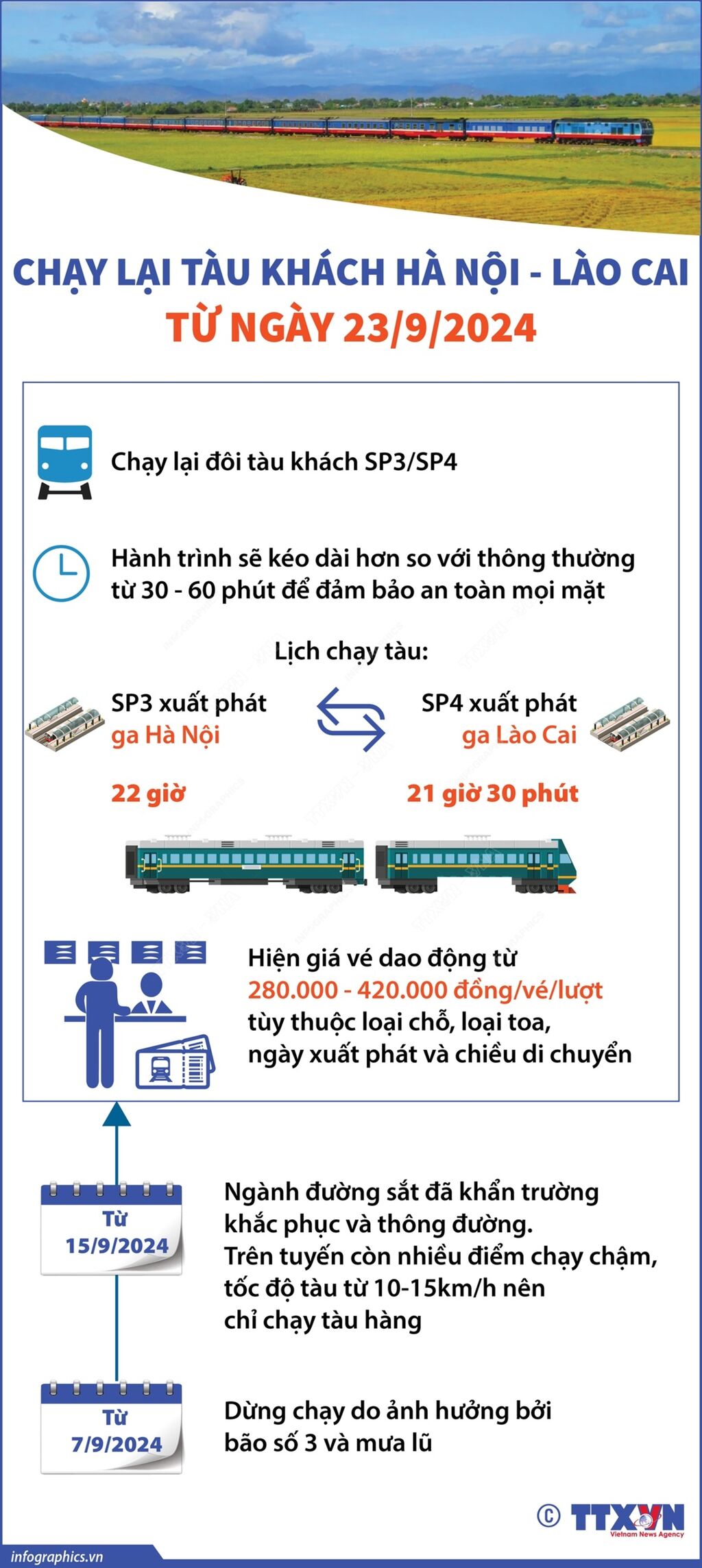 Nhằm phục vụ nhu cầu đi lại của người dân và khách du lịch Sapa, ngành đường sắt chạy lại đôi tàu khách SP3/SP4 tuyến Hà Nội - Lào Cai từ 23/9/2024.
