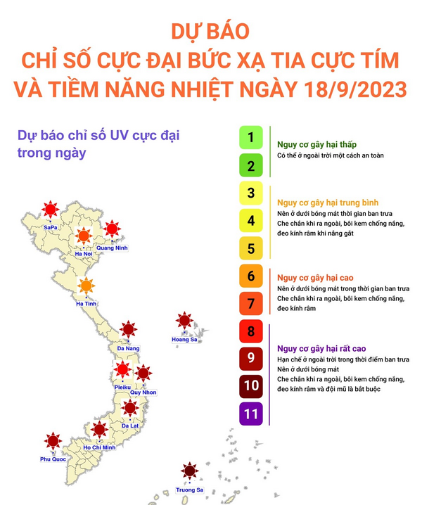 Ngày và đêm 18/9, Thủ đô Hà Nội, sáng có mưa rào rải rác và có nơi có dông; sau có mưa rào và dông vài nơi, ngày có nắng gián đoạn; trong mưa dông có khả năng xảy ra lốc, sét và gió giật mạnh. Nhiệt độ thấp nhất 25-27 độ C. Nhiệt độ cao nhất 32-34 độ C.