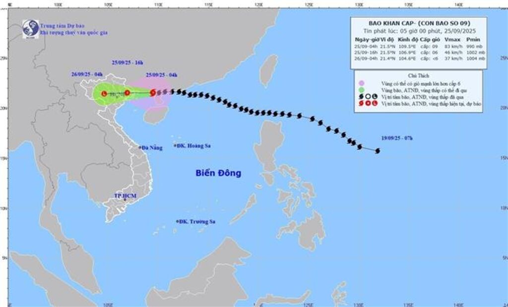 Chiều 25/9, bão số 9 khả năng suy yếu thành áp thấp nhiệt đới trên đất liền khu vực Đông Bắc Bắc Bộ.