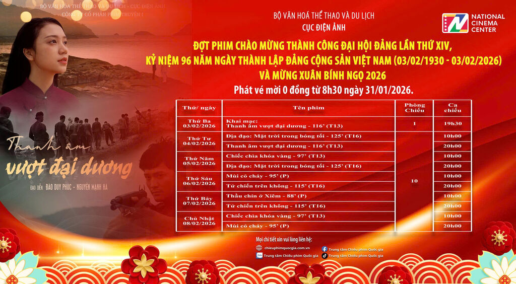 Đợt phim Chào mừng thành công Đại hội Đảng lần thứ XIV, Kỷ niệm 96 năm Ngày thành lập Đảng Cộng sản Việt Nam và Mừng Xuân Bính Ngọ 2026 sẽ diễn ra từ ngày 3-22/2/2026.