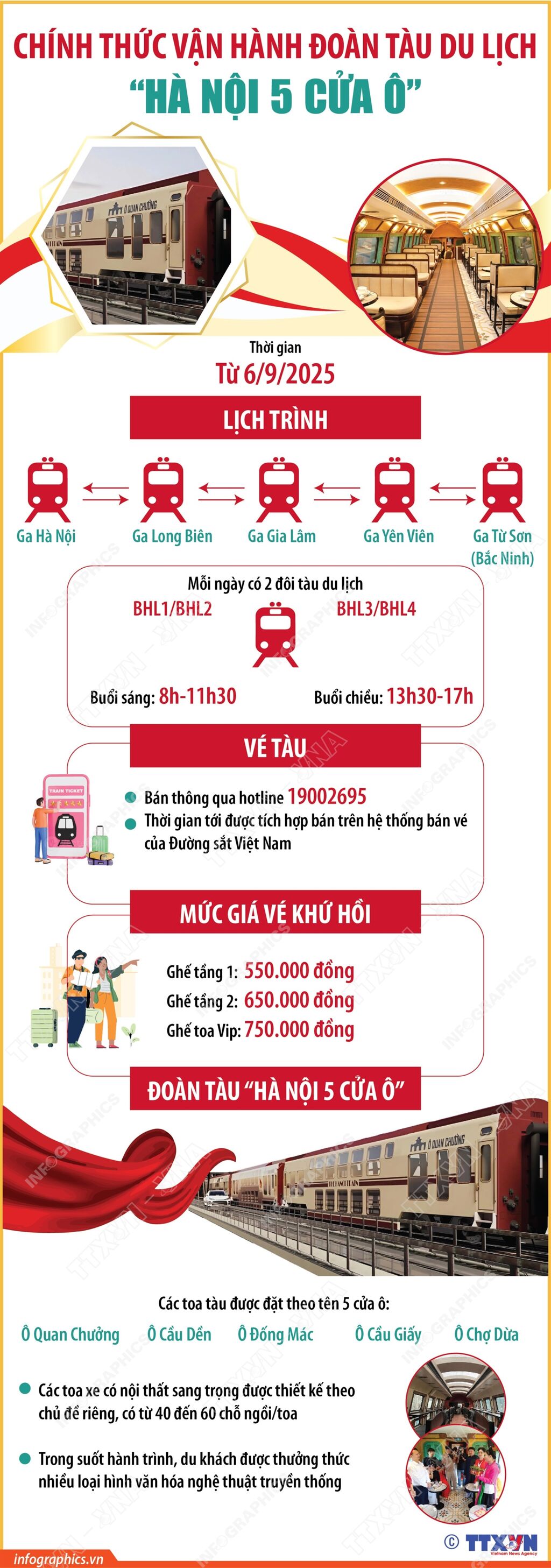 Từ ngày 6/9/2025, Tổng công ty Đường sắt Việt Nam (VNR) chính thức tổ chức chạy tàu du lịch văn hoá “Hà Nội 5 cửa ô” (The Hanoi Train) trên tuyến Hà Nội - Từ Sơn (Bắc Ninh).
