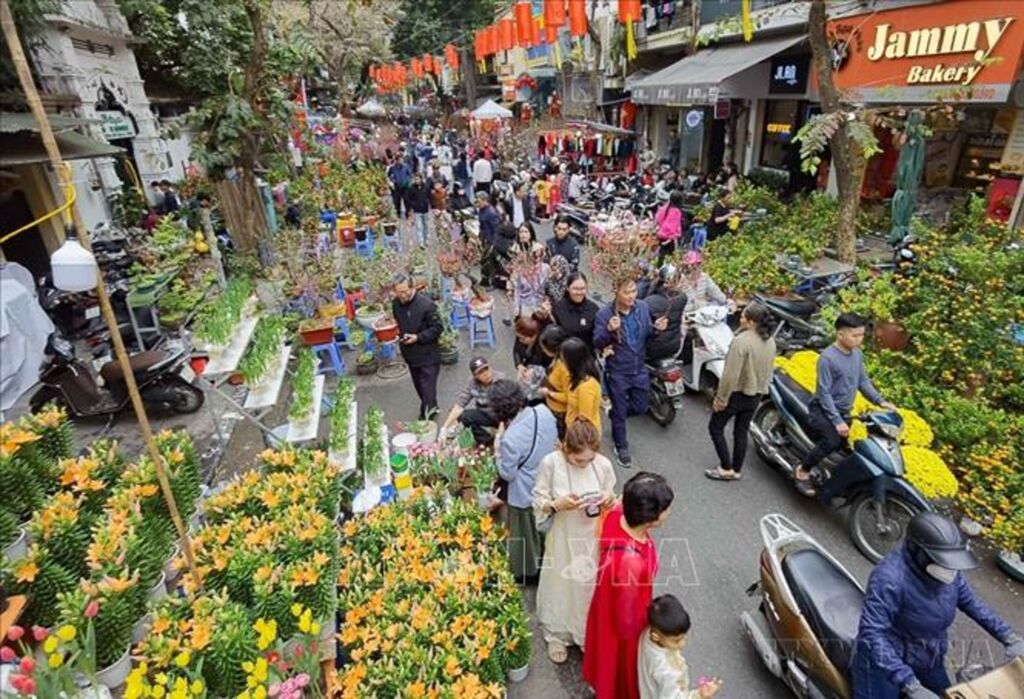 Người dân từ khắp các vùng trồng hoa mang đào, quất và nhiều chủng loại hoa Tết về, tạo nên một không gian náo nhiệt mang đậm không khí Tết.