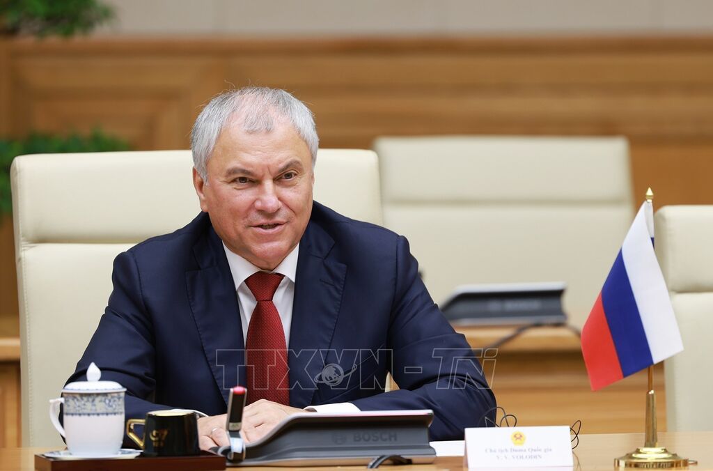 Tổng Bí thư Tô Lâm, Chủ tịch nước Lương Cường tiếp Chủ tịch Duma Quốc gia Quốc hội Liên bang Nga Vyacheslav Volodin. Thủ tướng Chính phủ Phạm Minh Chính hội kiến với Chủ tịch Duma Quốc gia Quốc hội Liên bang Nga Vyacheslav Volodin. Chủ tịch Quốc hội Trần Thanh Mẫn đón, hội đàm với Chủ tịch Duma Quốc gia Quốc hội Liên bang Nga Vyacheslav Volodin. Lãnh đạo Quốc hội hai nước đã đồng chủ trì Phiên họp lần thứ tư Ủy ban Liên nghị viện về hợp tác giữa Quốc hội Việt Nam và Duma Quốc gia Nga.