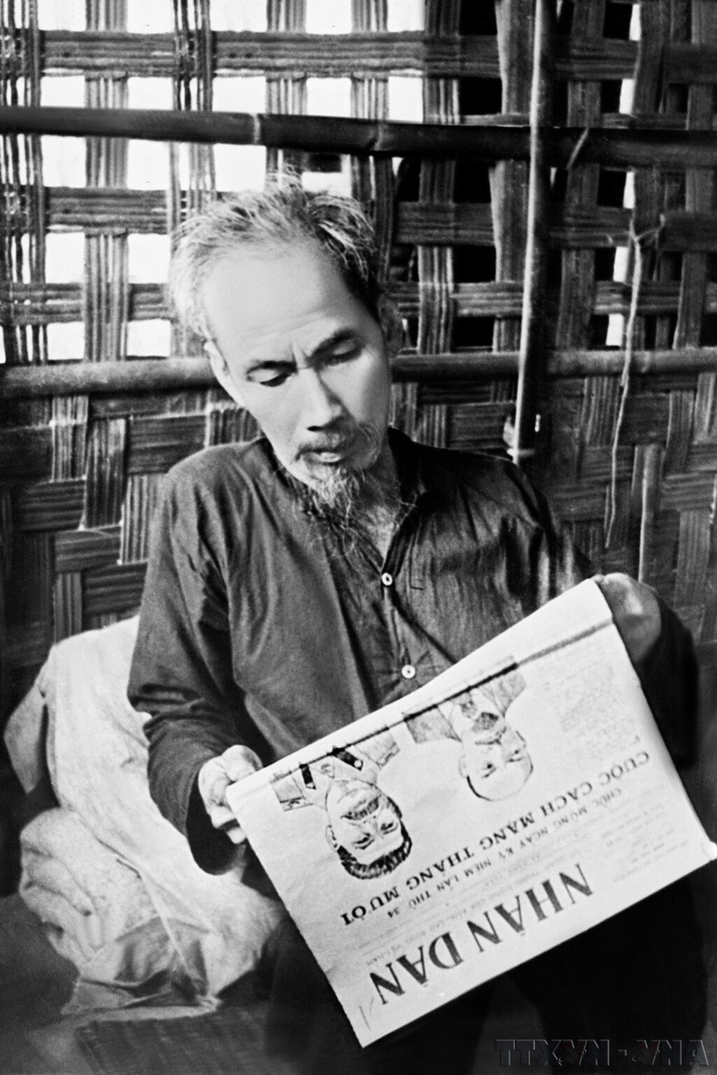 Chủ tịch Hồ Chí Minh là độc giả tích cực của báo chí trong nước và thế giới. Bác tự rèn mình một phong cách đọc báo đều đặn, nghiêm túc. Bác không hẹn tiếp khách vào đầu giờ làm việc hàng ngày, giờ đó việc đầu tiên là Người xem qua các báo. Trong ảnh: Bác Hồ đọc báo Nhân Dân ở chiến khu Việt Bắc (1951).