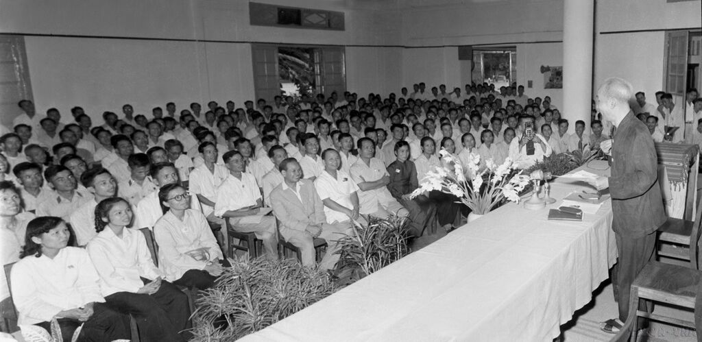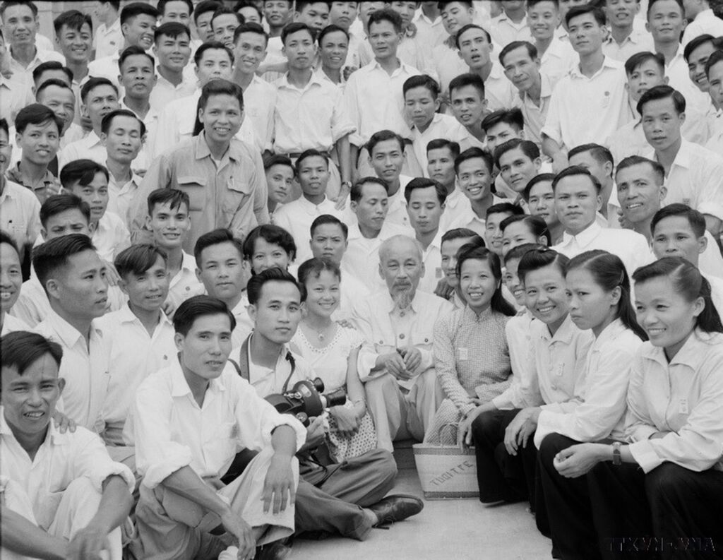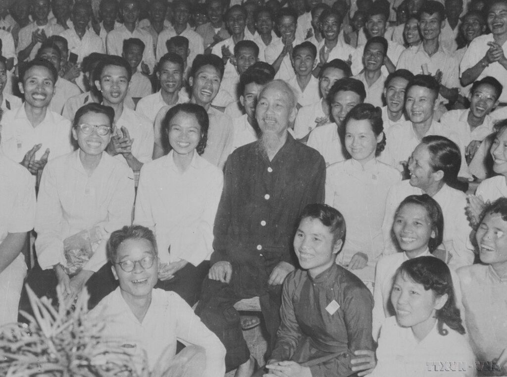 Chủ tịch Hồ Chí Minh, Phó Chủ tịch Tôn Đức Thắng và đồng chí Trường Chinh chụp ảnh lưu niệm với nhóm phóng viên thông tấn, báo chí phục vụ Đại hội lần thứ III của Đảng (năm 1960). Người ngồi giữa Bác Hồ và đồng chí Trường Chinh là nhà báo Huỳnh Thị Hường (phóng viên Việt Nam Thông tấn xã) và người đeo kính ngồi sau Bác Hồ là nhà báo Lê Bá Thuyên (Phó Giám đốc VNTTX).