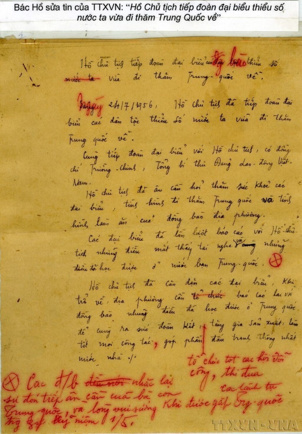 Báo chí là kênh thông tin vô cùng quan trọng của Chủ tịch Hồ Chí Minh, trong đó Bác luôn dành tình cảm, sự quan tâm đặc biệt cho Việt Nam Thông tấn xã (nay là Thông tấn xã Việt Nam). Dù bận trăm công nghìn việc, hằng ngày, Bác vẫn dành thời gian nghe đài, đọc bản tin của VNTTX. Bác đã nhiều lần tự tay sửa từng câu, từng từ, duyệt tin bài, căn dặn về nghề với phóng viên VNTTX. Trong ảnh: Bút tích Bác Hồ sửa tin của TTXVN.