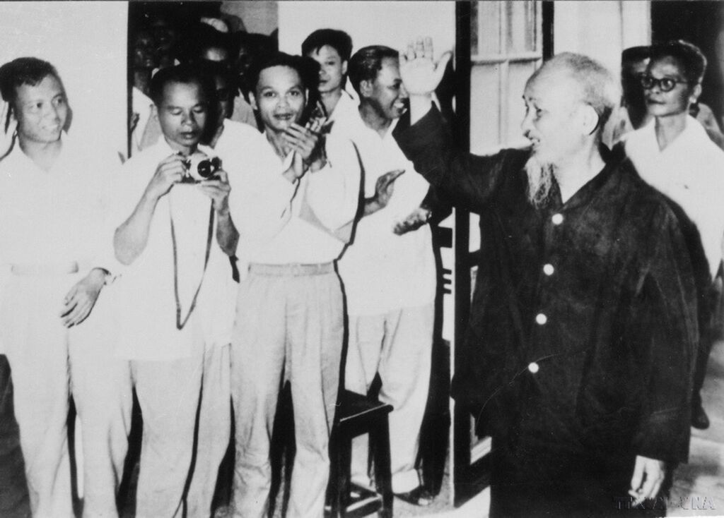 Chủ tịch Hồ Chí Minh rất coi trọng vai trò của báo chí, triệt để sử dụng báo chí và coi đây là một vũ khí sắc bén của cách mạng. Đối với người làm báo, Bác cho rằng “Cán bộ báo chí cũng là chiến sĩ cách mạng. Cây bút, trang giấy là vũ khí sắc bén của họ". Bác dạy các thế hệ người làm báo về nhiệm vụ của báo chí “Phục vụ nhân dân, phục vụ cách mạng”. Trong ảnh: Chủ tịch Hồ Chí Minh với các nhà báo trong nước và quốc tế đưa tin về Đại hội Đảng toàn quốc lần thứ III (9/1960).