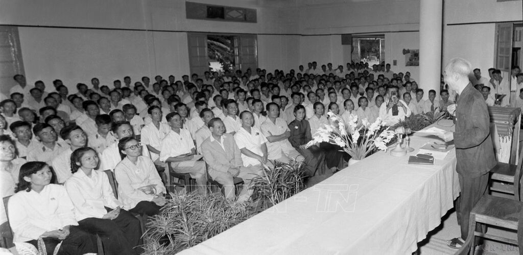 Chủ tịch Hồ Chí Minh, Phó Chủ tịch Tôn Đức Thắng và đồng chí Trường Chinh chụp ảnh lưu niệm với nhóm phóng viên thông tấn, báo chí phục vụ Đại hội lần thứ III của Đảng (năm 1960). Người ngồi giữa Bác Hồ và đồng chí Trường Chinh là nhà báo Huỳnh Thị Hường (phóng viên Việt Nam Thông tấn xã) và người đeo kính ngồi sau Bác Hồ là nhà báo Lê Bá Thuyên (Phó Giám đốc VNTTX).