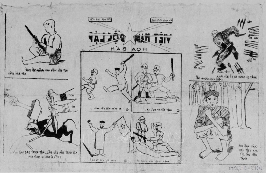 Văn phong báo chí và phong cách làm báo độc đáo của Chủ tịch Hồ Chí Minh luôn hướng tới việc làm sao cho bài viết sinh động, hấp dẫn, dễ hiểu, dễ nhớ để truyền bá, cổ động tư tưởng, hành động cách mạng đến từng cá nhân đối tượng của bài báo. Trong ảnh: Những bức hình đăng trên báo “Việt Nam độc lập” do Chủ tịch Hồ Chí Minh sáng lập, phát hành ngày 10/4/1945, tuyên truyền cổ động cho phong trào cách mạng Việt Nam.