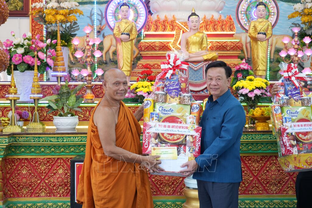 Nhân dịp Tết Chôl Chnăm Thmây, đoàn đã trao tặng quà cho các chư tăng, ban quản trị chùa; các hộ Khmer tiêu biểu và 10 em học sinh tiêu biểu là người Khơ me./.