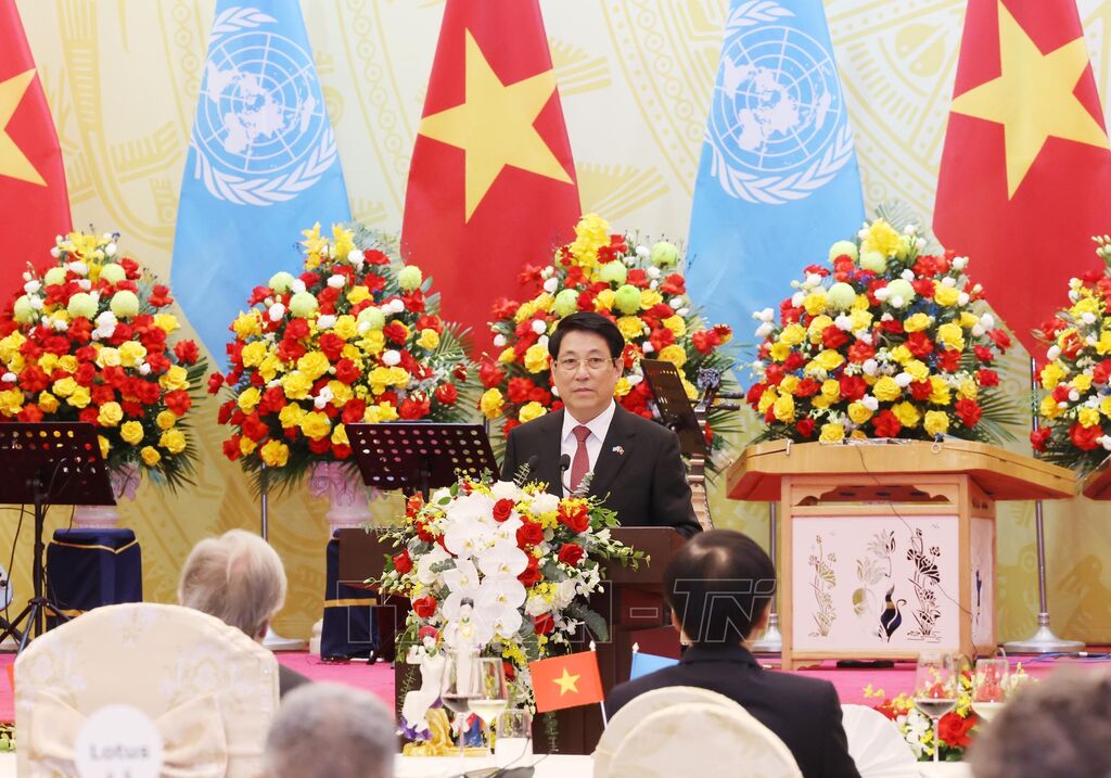Chủ tịch nước khẳng định Việt Nam luôn ghi nhớ, trân trọng sự hỗ trợ quý báu mà Liên hợp quốc dành cho Việt Nam để hàn gắn vết thương chiến tranh, xây dựng và phát triển đất nước. Từ Liên hợp quốc, Việt Nam đã đến với thế giới, để hợp tác phát triển và hội nhập, góp phần vào các nỗ lực chung vì hòa bình, phát triển và tiến bộ. Cũng từ Liên hợp quốc, thế giới đến với Việt Nam, mang theo tri thức, kinh nghiệm, nguồn lực và tình đoàn kết, giúp Việt Nam vượt qua khó khăn, vươn lên mạnh mẽ.