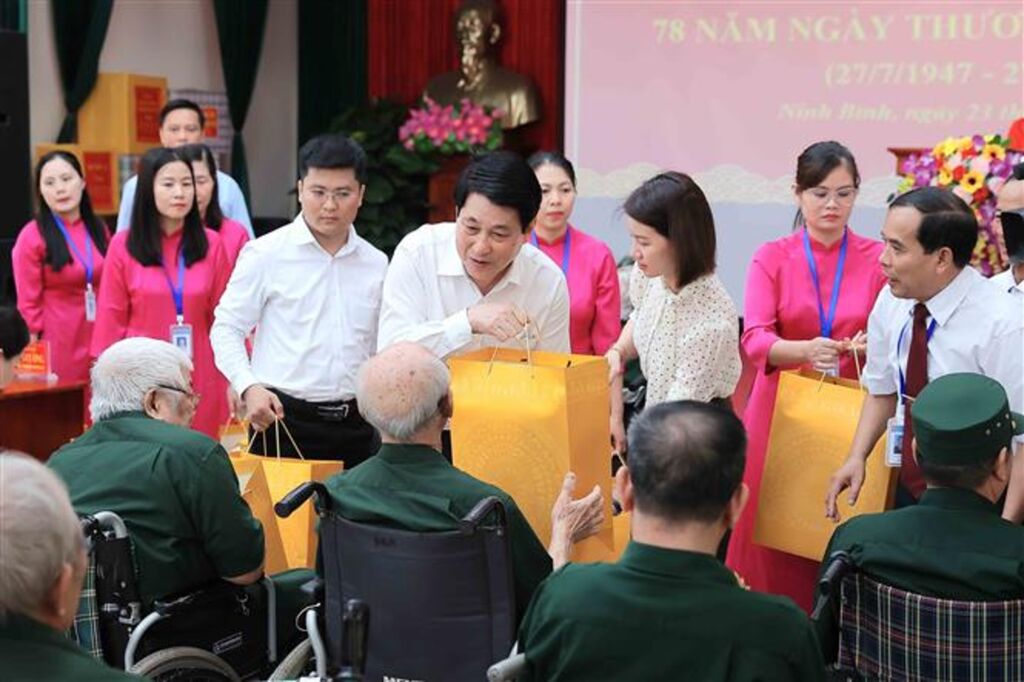 Nhân dịp này, Chủ tịch nước Lương Cường và đại diện các ban, bộ, ngành Trung ương, tỉnh Ninh Bình đã thăm hỏi, tặng quà các thương binh, bệnh binh và Trung tâm Điều dưỡng thương binh Duy Tiên./.
