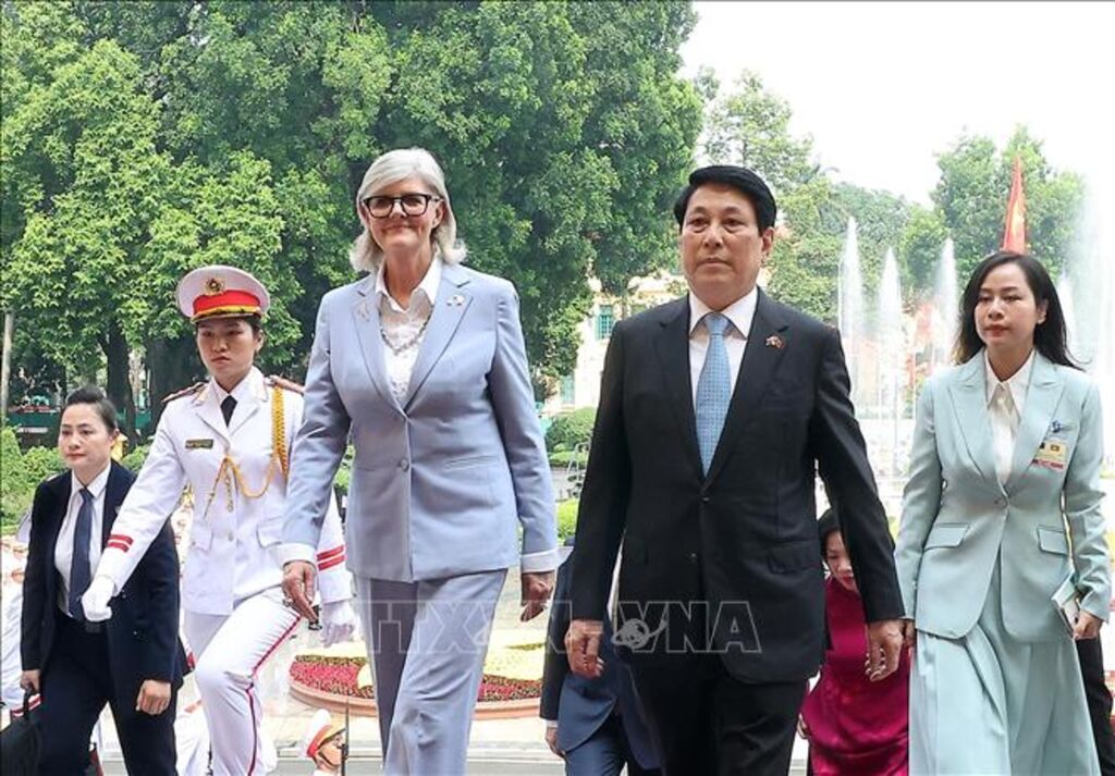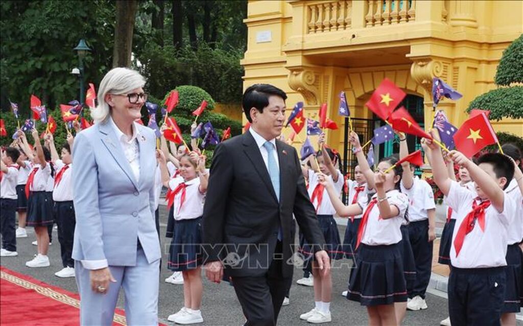 Đoàn xe hộ tống đưa Toàn quyền Sam Mostyn và Phu quân tiến vào Phủ Chủ tịch, Chủ tịch nước Lương Cường và Phu nhân có mặt tại thảm đỏ nồng nhiệt chào đón Toàn quyền Sam Mostyn dẫn đầu Đoàn cấp cao Australia thăm cấp Nhà nước đến Việt Nam. Sau đó, các cháu thiếu nhi Thủ đô tiến tới tặng Toàn quyền Sam Mostyn và Phu quân những bó hoa tươi thắm.