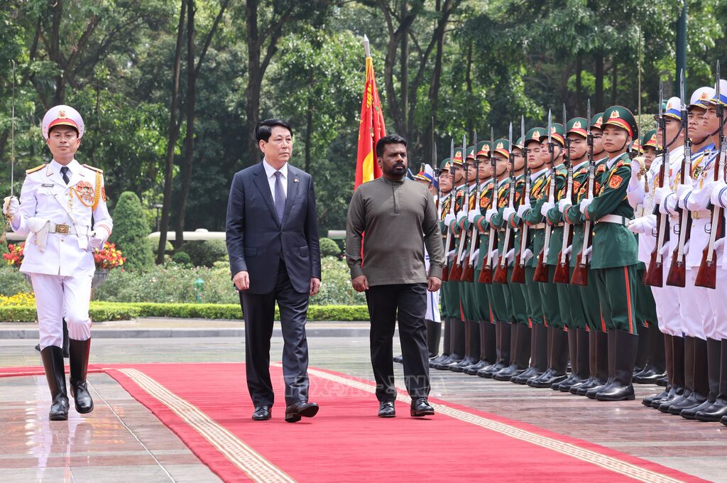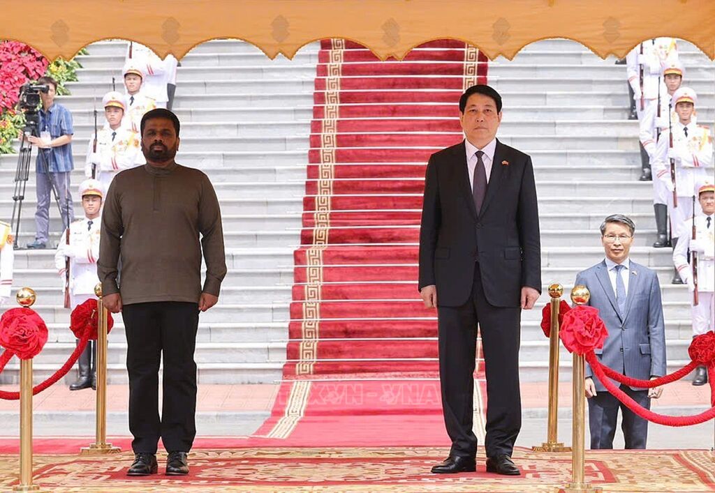 Trong tiếng nhạc chào mừng, Chủ tịch nước Lương Cường và Tổng thống Sri Lanka đi dọc thảm đỏ bước lên bục danh dự. Sau khi nghe Quốc thiều hai nước, Chủ tịch nước Lương Cường và Tổng thống Anura Kumara Dissanayaka rời bục, bước tới cúi chào quân kỳ và duyệt Đội Danh dự Quân đội nhân dân Việt Nam. Tiếp đó, hai nhà lãnh đạo giới thiệu thành phần Đoàn cấp cao hai nước tham dự Lễ đón.