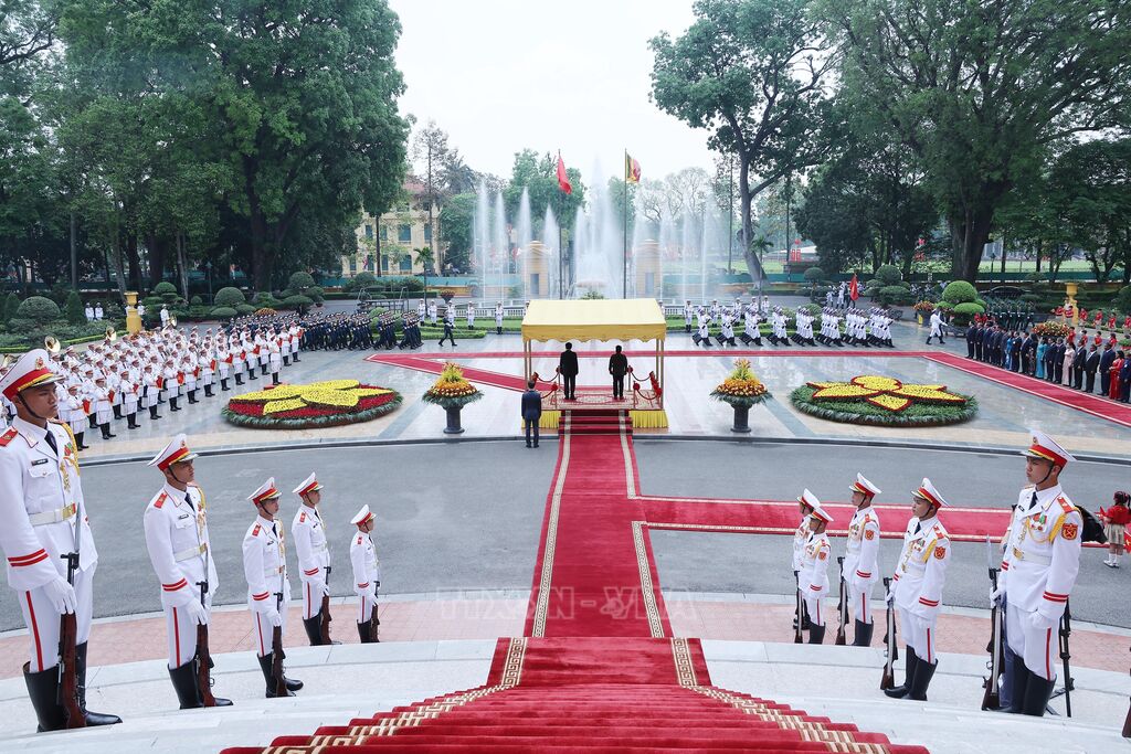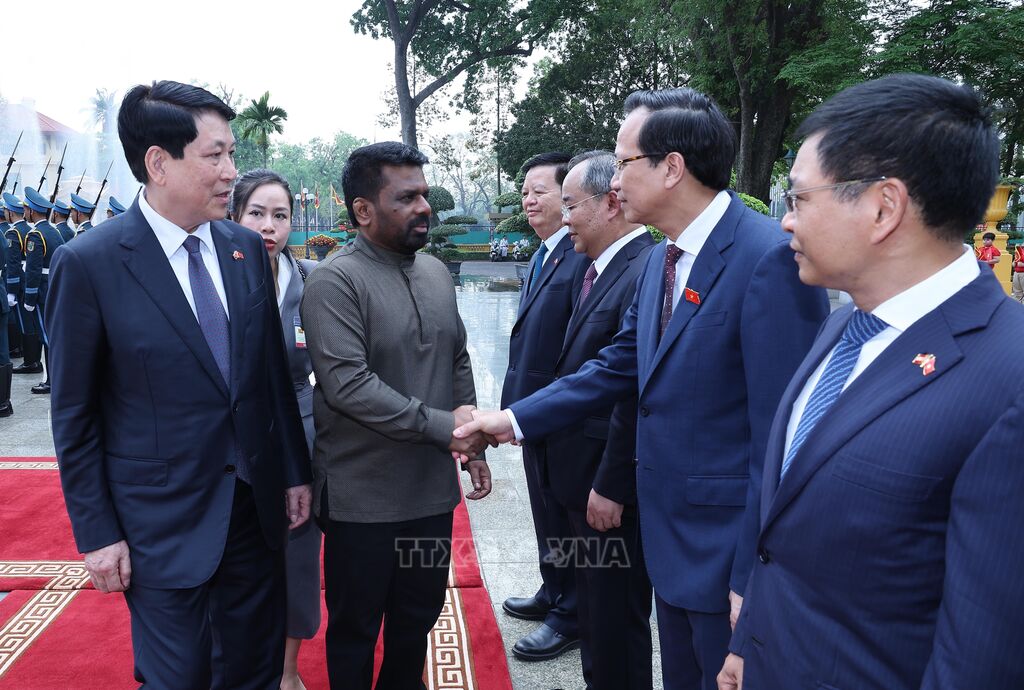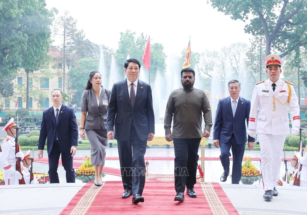 Đoàn xe hộ tống đưa Tổng thống Anura Kumara Dissanayaka tiến vào Phủ Chủ tịch, Chủ tịch nước Lương Cường có mặt tại thảm đỏ nồng nhiệt chào đón Tổng thống Anura Kumara Dissanayaka dẫn đầu Đoàn cấp cao Sri Lanka thăm cấp Nhà nước tới Việt Nam. Đại diện các cháu thiếu nhi Thủ đô tiến tới trao tặng Tổng thống Anura Kumara Dissanayaka bó hoa tươi thắm.