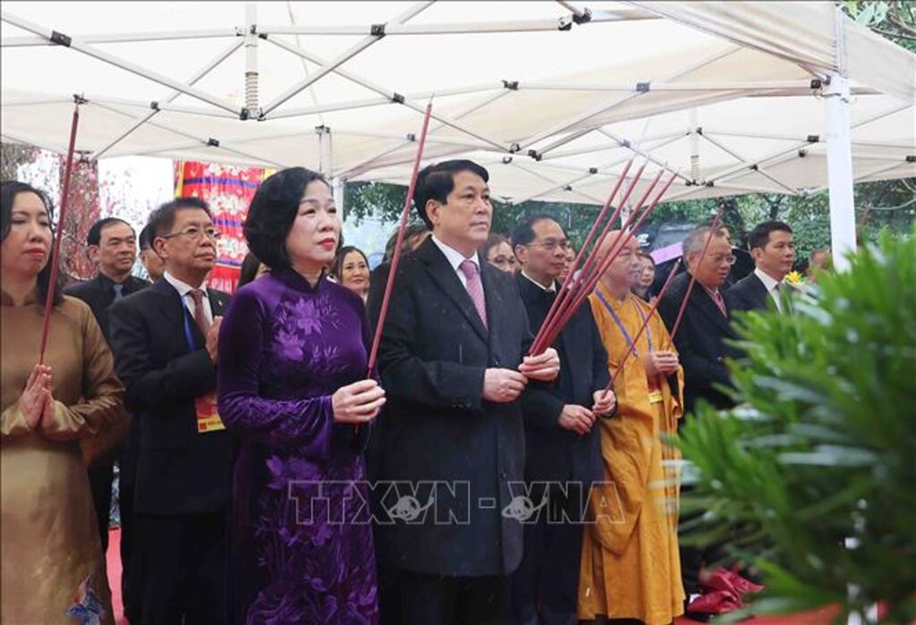 Chủ tịch nước và Phu nhân cùng các đại biểu, kiều bào đã thành kính dâng hương tưởng nhớ công ơn của đức Lý Thái Tổ và các vị tiên hiền, tiên liệt, các vị liệt tổ, liệt tông đã xây dựng và bảo vệ Thăng Long - Hà Nội nghìn năm văn hiến...