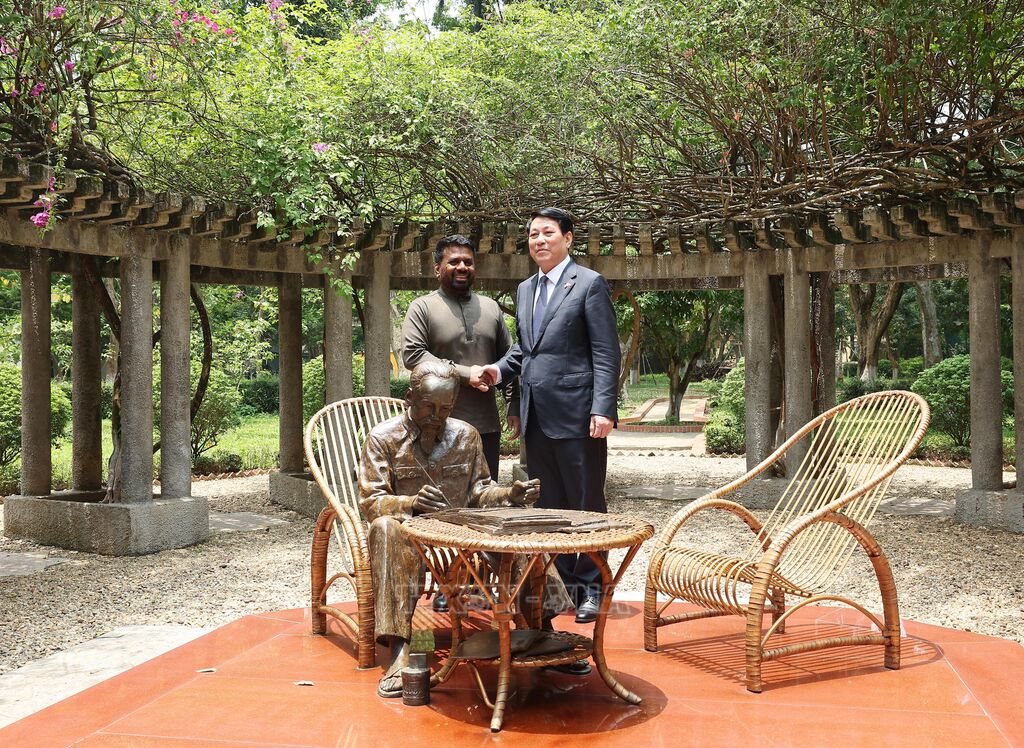 Cùng dạo bước trong Khu di tích Chủ tịch Hồ Chí Minh, Chủ tịch nước Lương Cường và Tổng thống Anura Kumara Dissanayaka đã thăm các di tích gắn liền với cuộc đời và sự nghiệp của Chủ tịch Hồ Chí Minh như nhà sàn, ao cá, chiêm ngưỡng tượng đồng “Bác Hồ ngồi làm việc trong vườn hoa Phủ Chủ tịch” và những hiện vật lưu giữ nhiều kỷ niệm về Người.