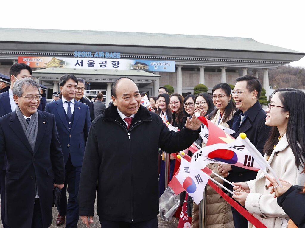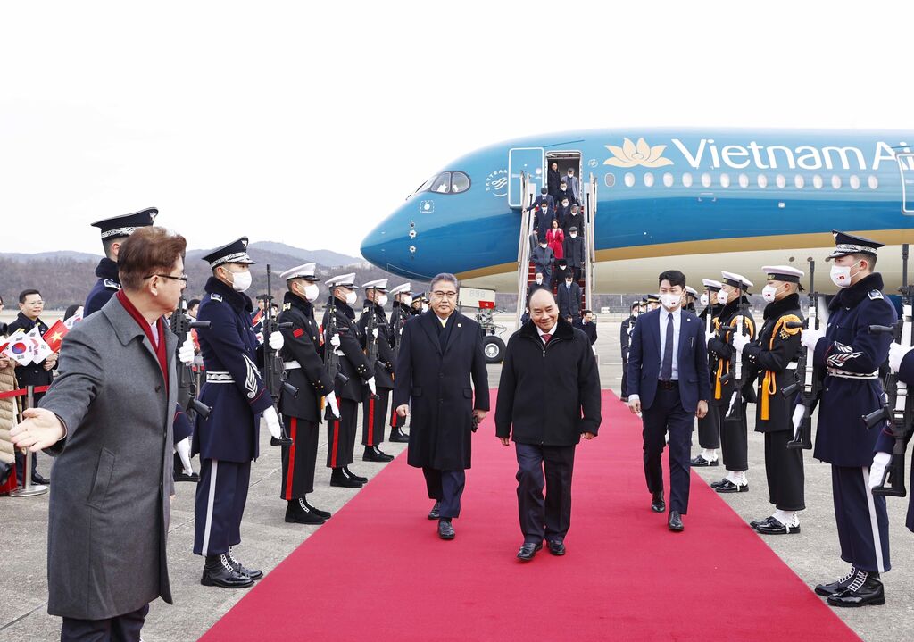 Lễ đón Chủ tịch nước Nguyễn Xuân Phúc và Đoàn tại sân bay diễn ra trọng thị với hai hàng tiêu binh danh dự, bồng súng chỉnh tề hai bên thảm đỏ và đoàn thiếu nhi Hàn Quốc tặng hoa chào mừng Chủ tịch nước Nguyễn Xuân Phúc tới Thủ đô Seoul.