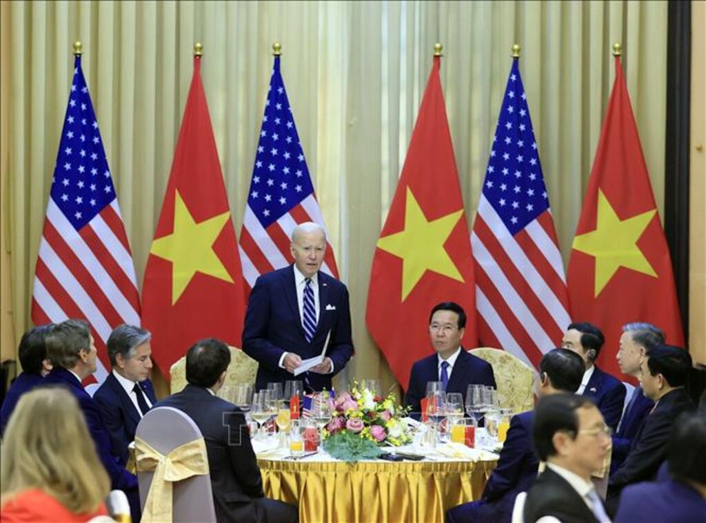 Phát biểu tại chiêu đãi, Chủ tịch nước Võ Văn Thưởng bày tỏ tin tưởng, tiếp nối chiều dài lịch sử quan hệ Việt Nam - Hoa Kỳ, với niềm tin, sự hiểu biết và tôn trọng lẫn nhau, với xung lực mới mà hai nước xác lập trong chuyến thăm Việt Nam lần này của Ngài Tổng thống, quan hệ Đối tác chiến lược toàn diện, vì hòa bình, hợp tác và phát triển bền vững giữa Việt Nam - Hoa Kỳ sẽ phát triển mạnh mẽ và thực chất, mang lại lợi ích thiết thực cho nhân dân hai nước, đóng góp tích cực cho hòa bình, hữu nghị, hợp tác, phát triển bền vững ở khu vực và trên thế giới.
