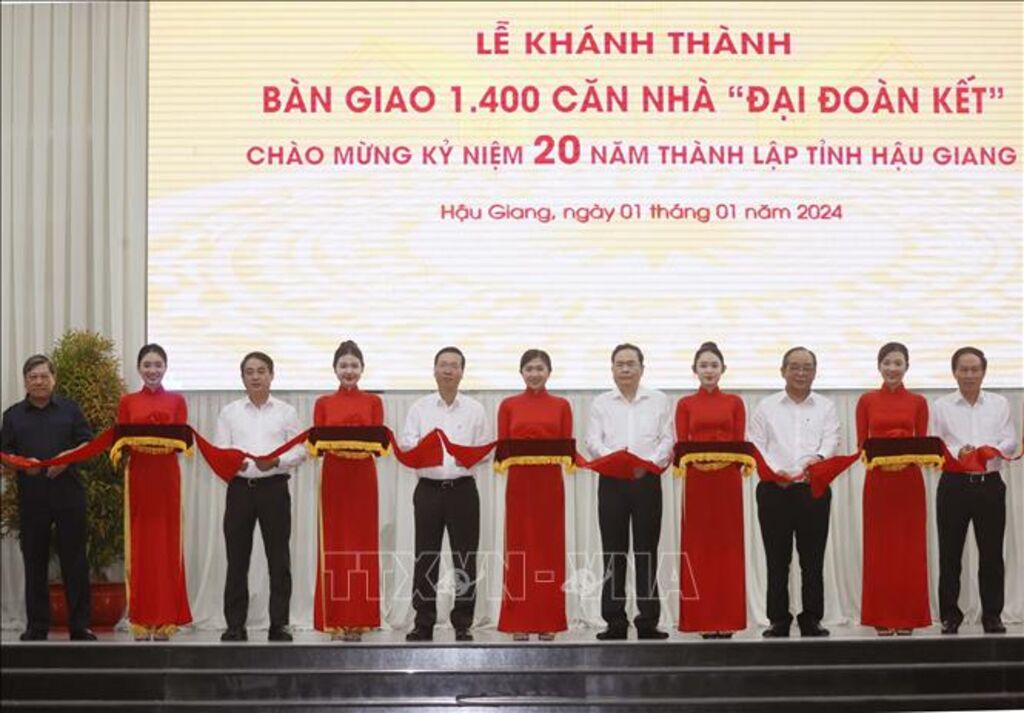 TTXVN - Tiếp tục chuyến công tác trong ngày đầu tiên của năm mới 2024, ngay sau khi dự Lễ tổng kết công tác vận động, hỗ trợ xây dựng nhà cho người nghèo tại Sóc Trăng, chiều 1/1, Chủ tịch nước Võ Văn Thưởng đã tới dự Lễ khánh thành bàn giao 1.400 căn nhà “Đại đoàn kết” chào mừng Kỷ niệm 20 năm thành lập tỉnh Hậu Giang (1/1/2004 - 1/1/2024). Cùng dự có Ủy viên Bộ Chính trị, Phó Chủ tịch Thường trực Quốc hội Trần Thanh Mẫn.