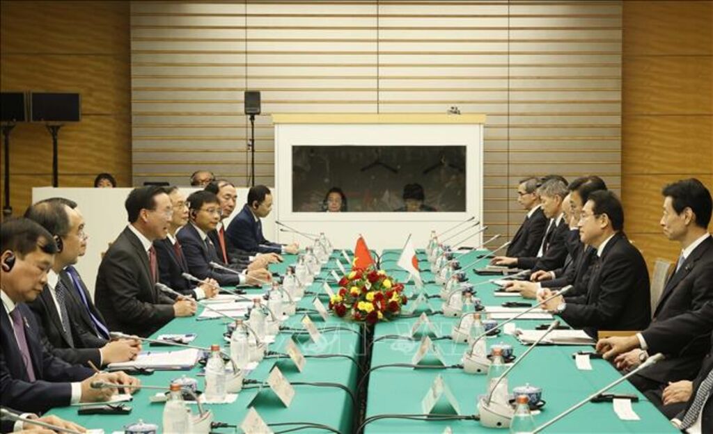 Trong bầu không khí hữu nghị, thân tình và tin cậy, Chủ tịch nước Võ Văn Thưởng và Thủ tướng Kishida Fumio điểm lại quan hệ hai nước trong 50 năm qua và bày tỏ hài lòng về sự phát triển mạnh mẽ, toàn diện, thực chất trên tất cả các lĩnh vực của quan hệ hai nước với sự tin cậy chính trị cao, sự gắn kết chặt chẽ trên các lĩnh vực kinh tế, nguồn nhân lực, hợp tác địa phương. Chủ tịch nước Võ Văn Thưởng cho rằng quan hệ Việt Nam - Nhật Bản là hình mẫu tiêu biểu cho sự hợp tác hiệu quả, chân thành, với tiềm năng và triển vọng hết sức rộng mở. Trên cơ sở đó, hai nhà Lãnh đạo nhất trí nâng cấp quan hệ hai nước lên “Đối tác Chiến lược toàn diện vì hòa bình và thịnh vượng tại châu Á và trên thế giới”.